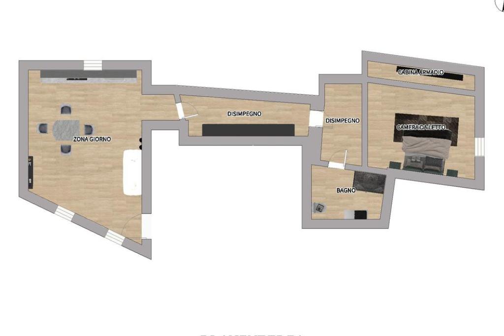 L'alloggio è formato da soggiorno con angolo cottura, disimpegno, camera da letto matrimoniale, bagno con doccia.