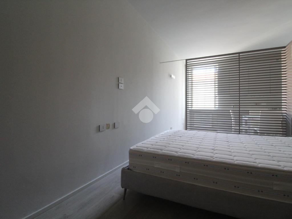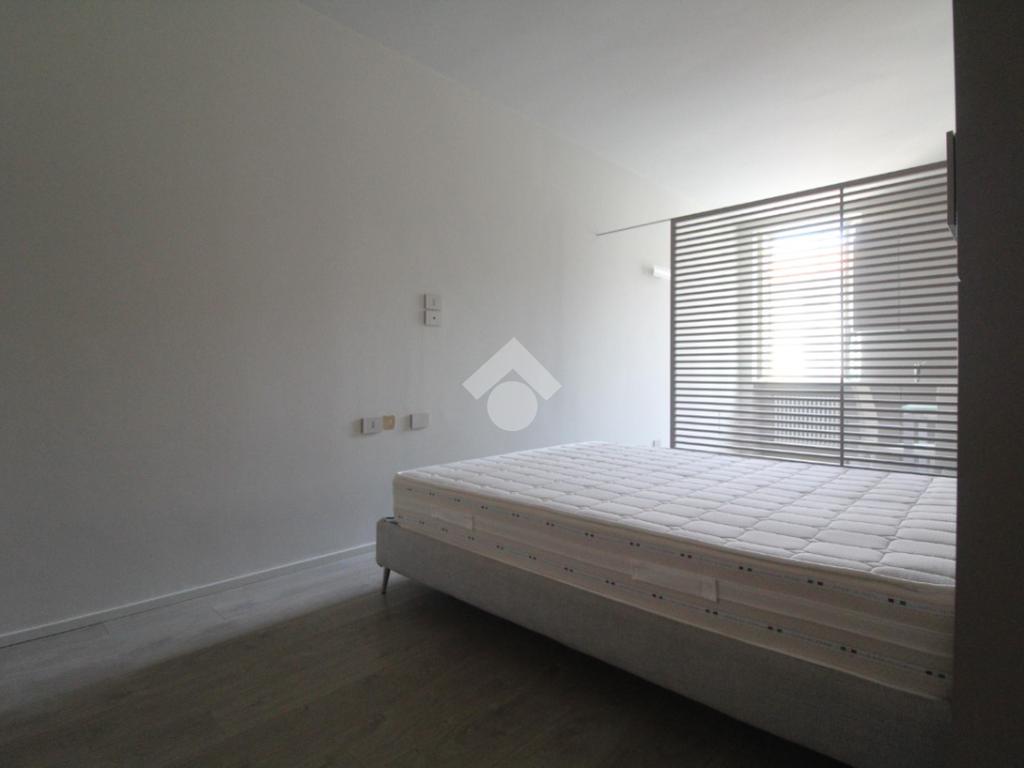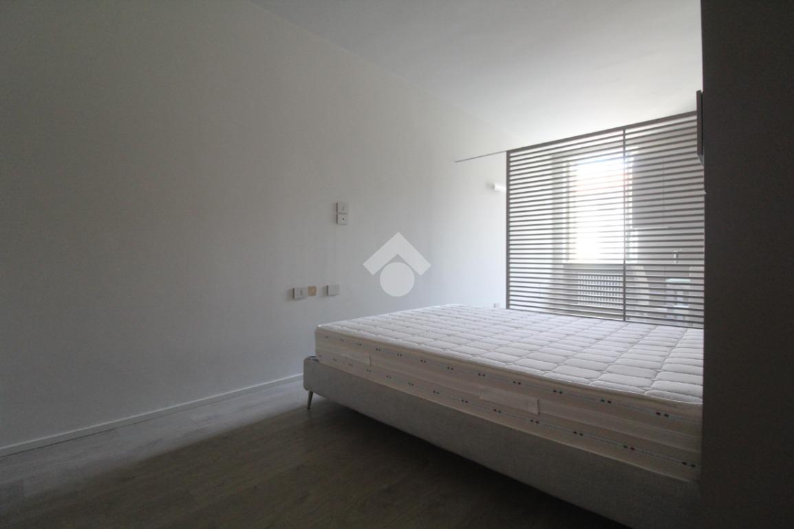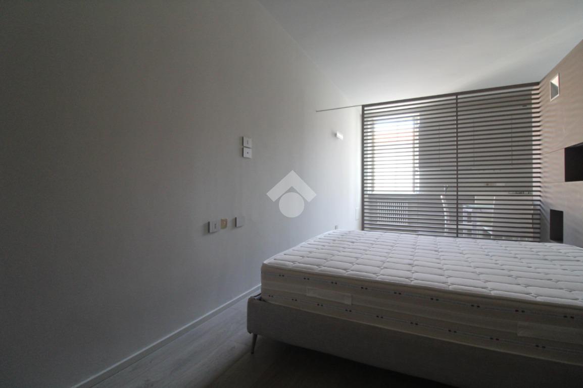 Formato da ambiente unico che racchiude sia la zona giorno che la zona notte che rimangono comunque separate da una parete divisoria decorativa a lamelle.