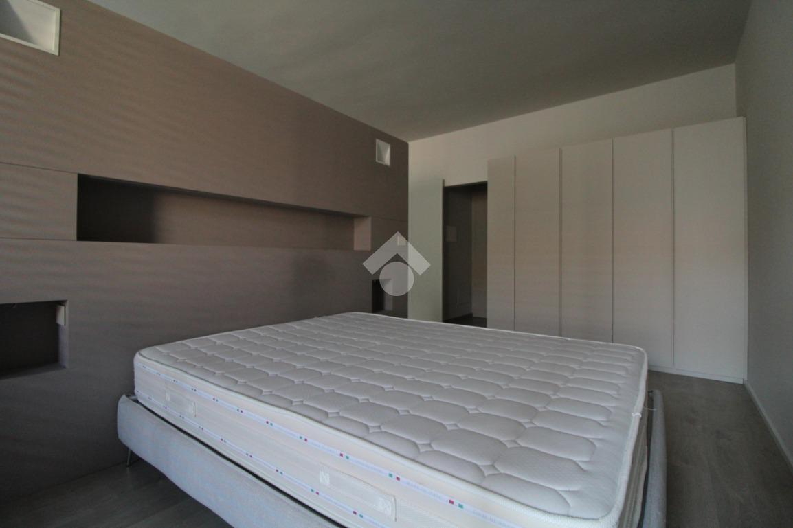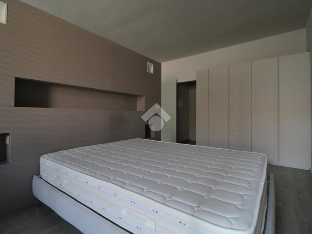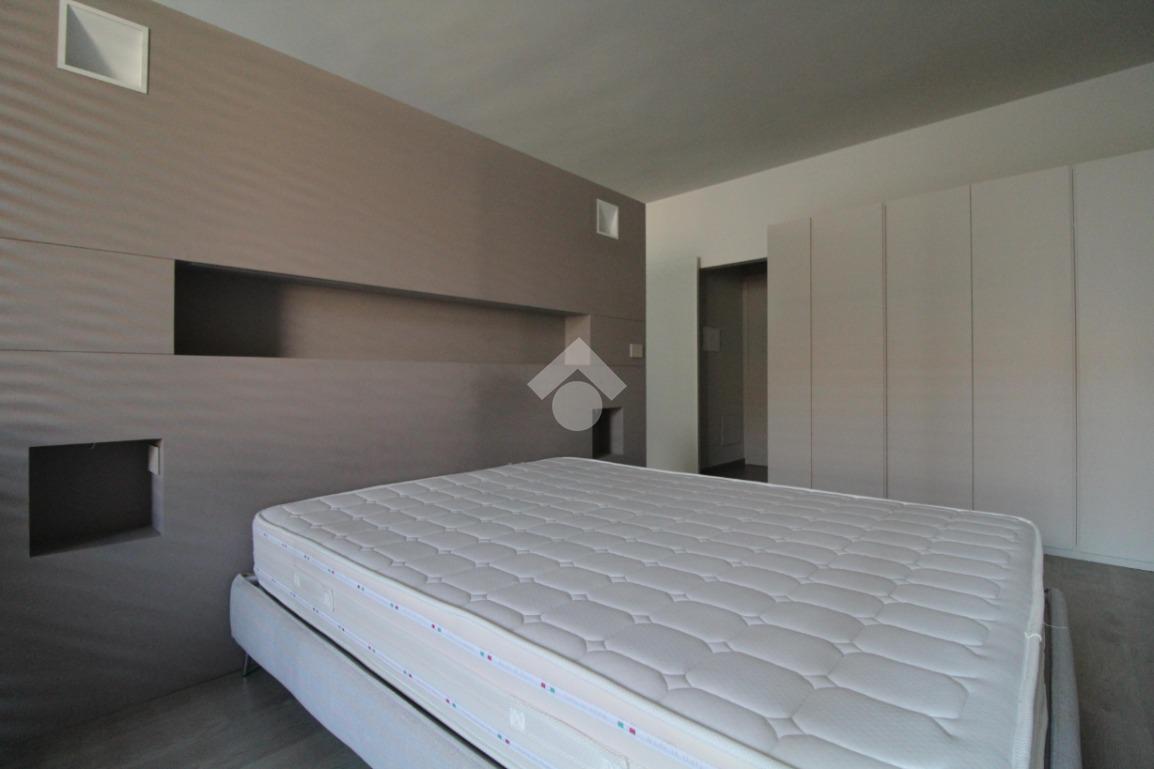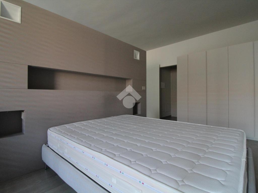 Formato da ambiente unico che racchiude sia la zona giorno che la zona notte che rimangono comunque separate da una parete divisoria decorativa a lamelle.