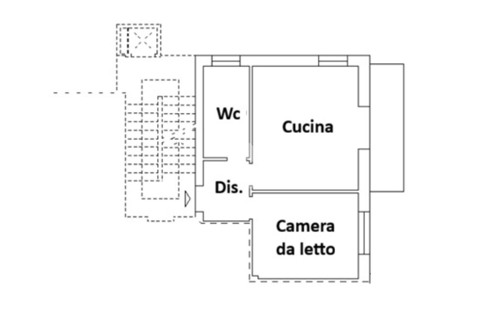 Formato da soggiorno con angolo cottura, camera da letto matrimoniale, bagno finestrato e balcone.