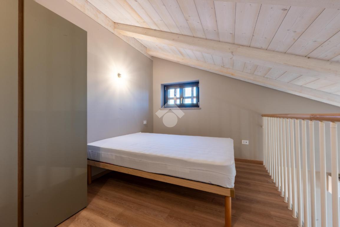 Formato da soggiorno con angolo cottura, bagno con doccia al piano sotto e camera da letto matrimoniale al piano superiore.