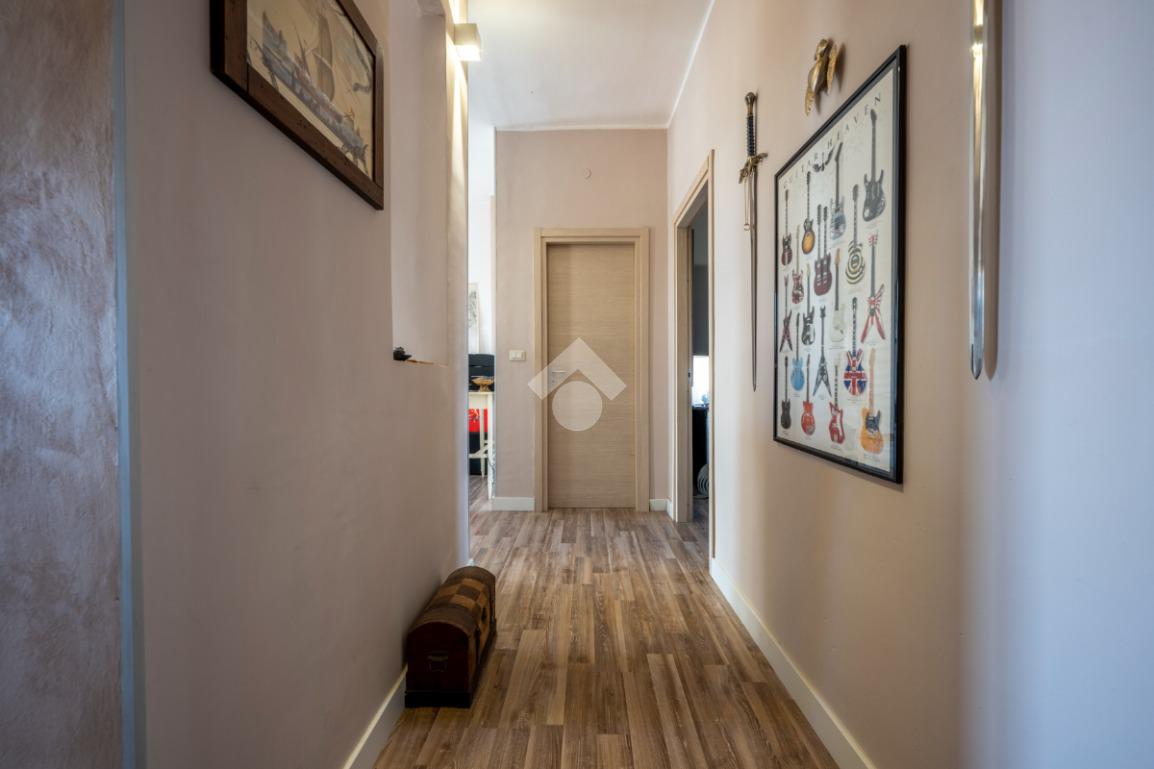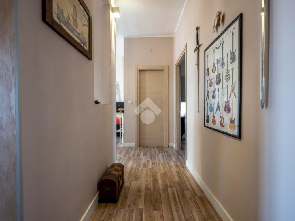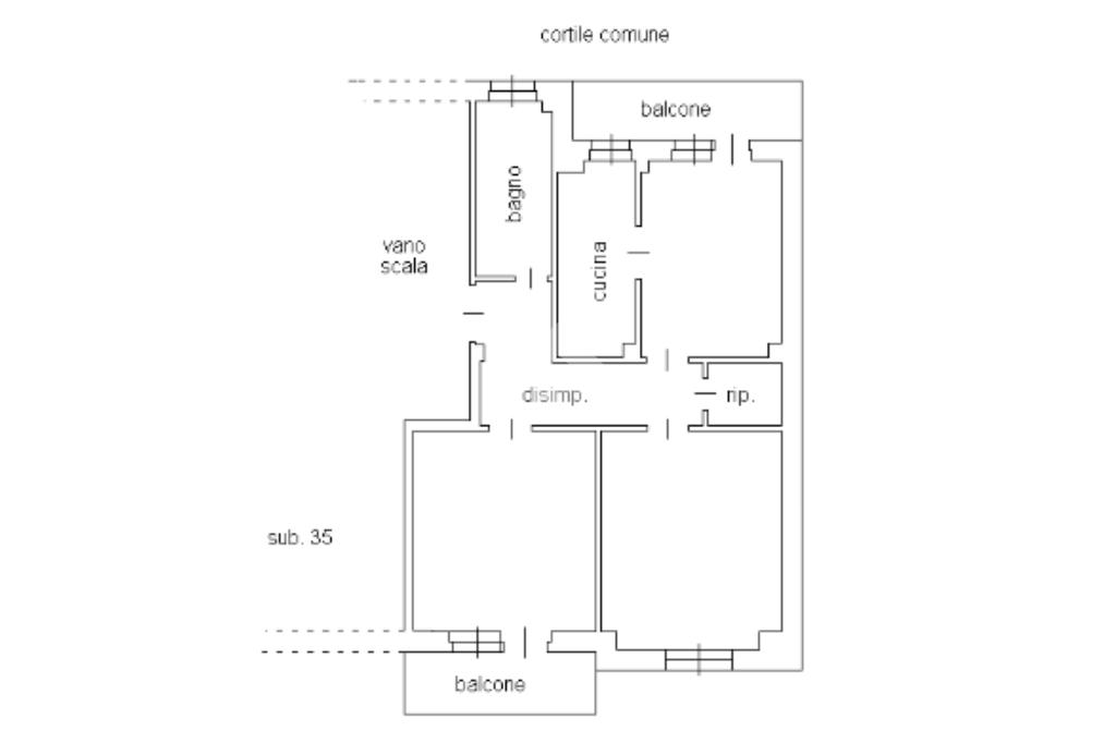 Ingresso in corridoio, soggiorno con angolo cottura, due camere da letto, bagno, ripostiglio, due balconi, soffitta e cantina.