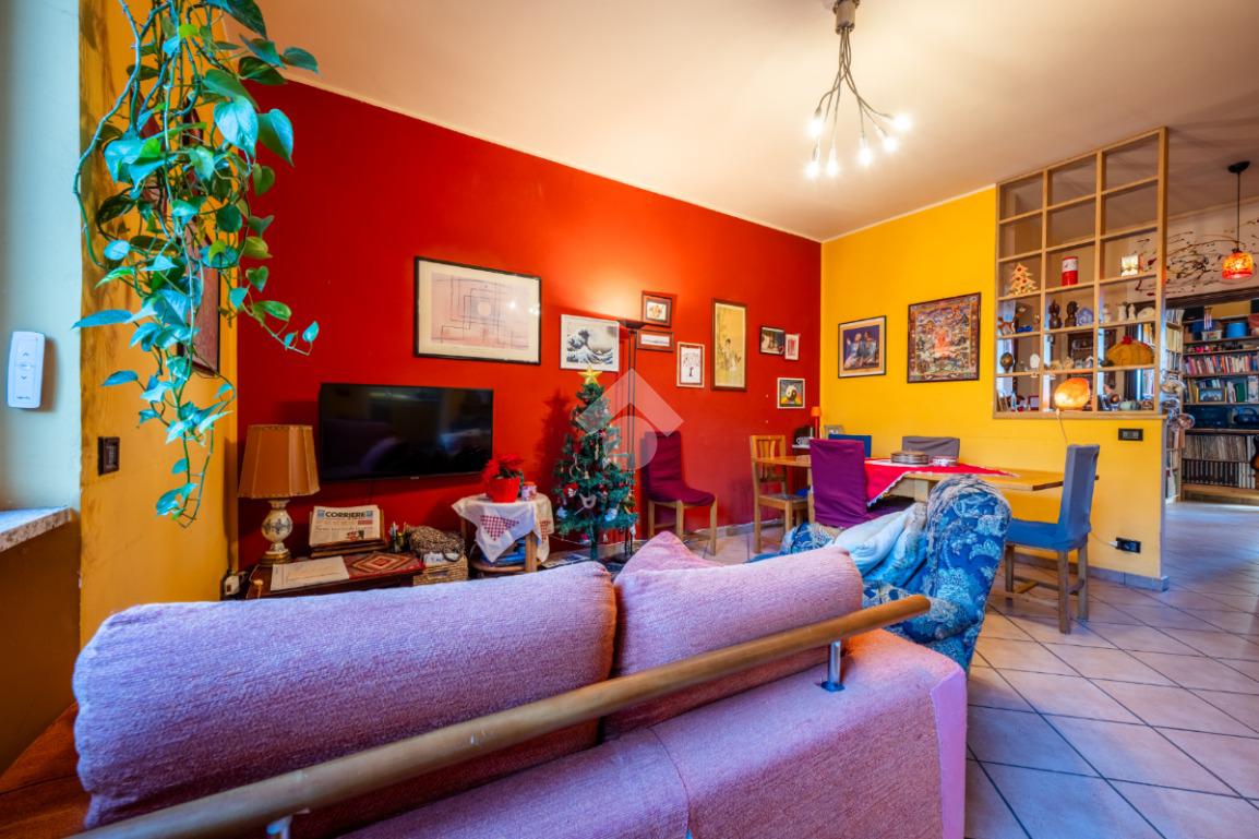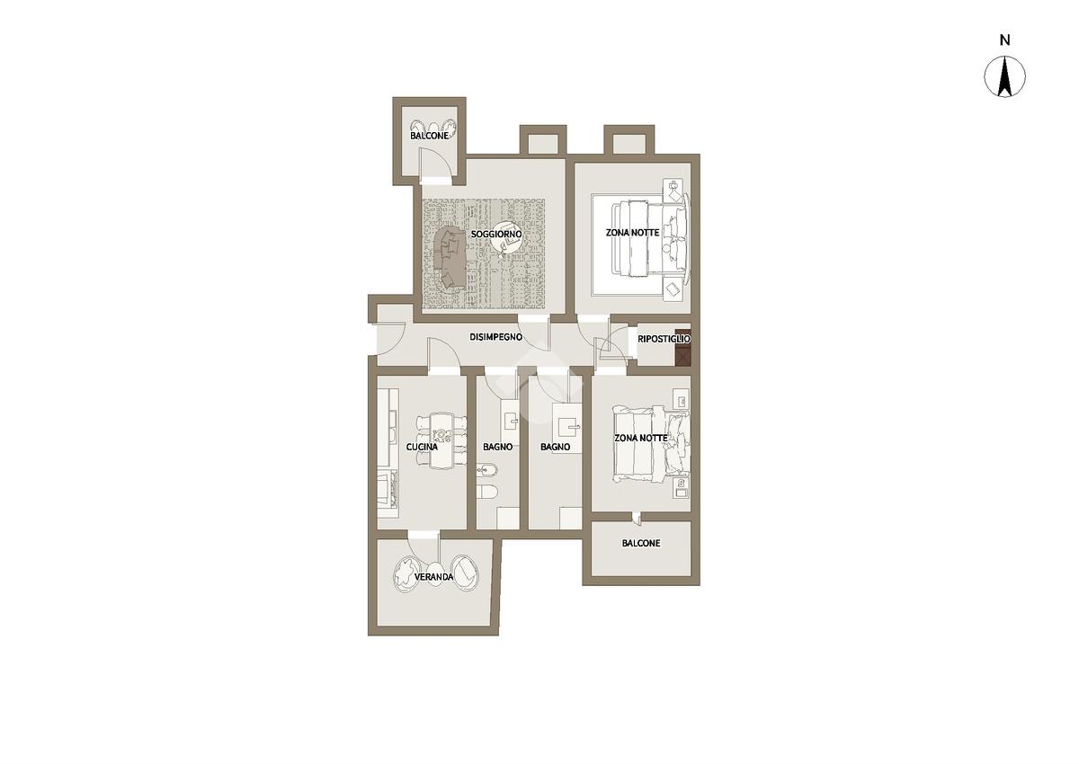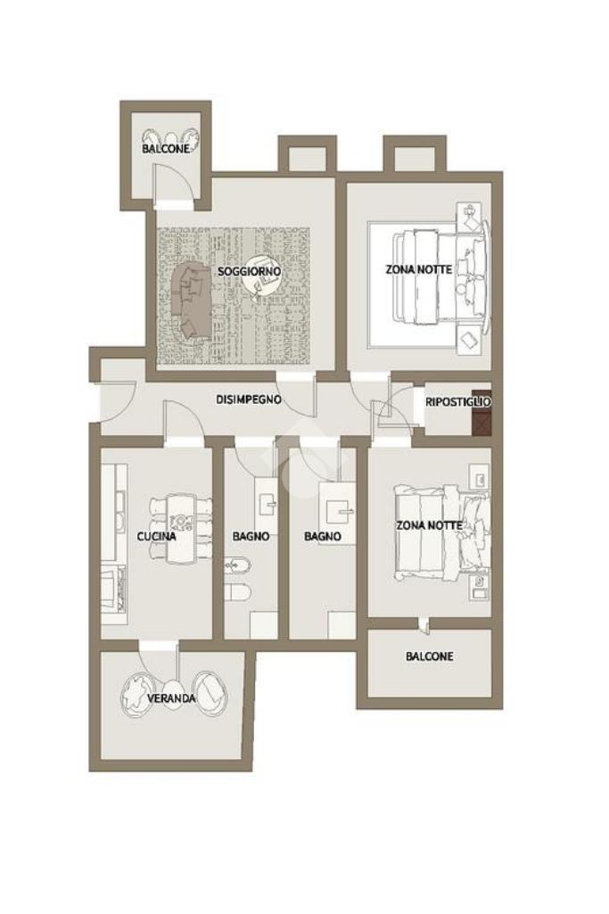 L'immobile è formato da un ingresso e un disimpegno che conducono a tutti i locali: ampio soggiorno, cucina abitabile, tinello, tre camere da letto utilizzabili a piacimento, doppi servizi e due ripostigli.