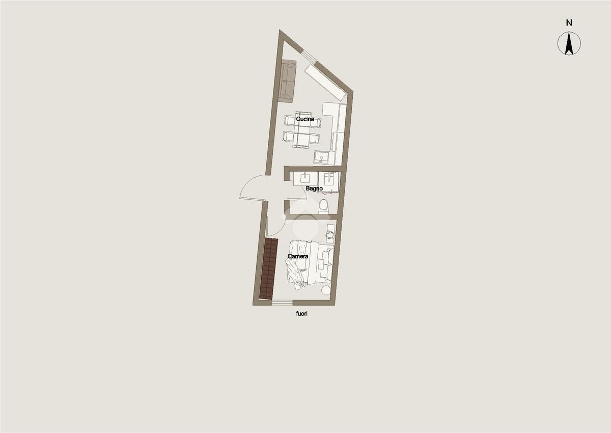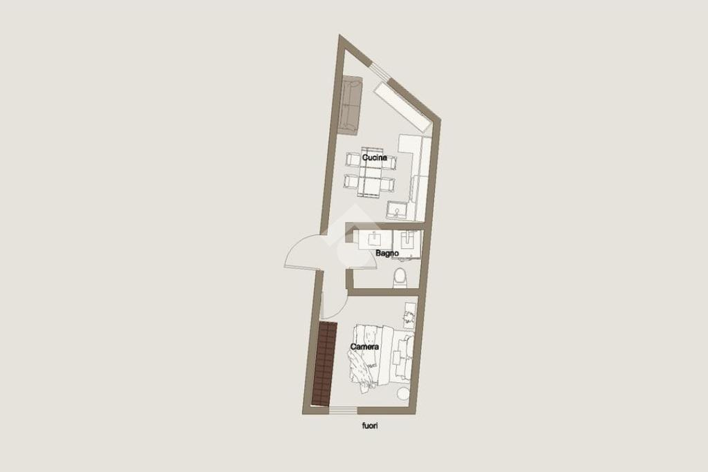 Formato da soggiorno con angolo cottura, camera da letto matrimoniale, bagno cieco con vasca (a breve verrà sostituita con una doccia) e sfogo esterno sul balcone.